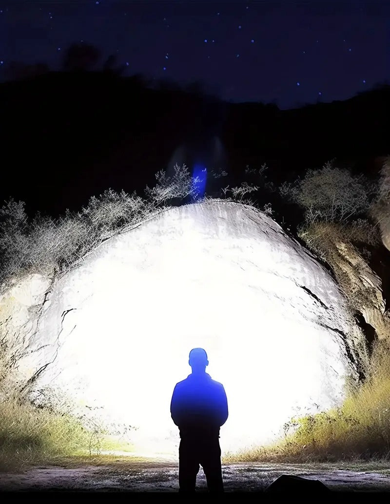 A robust flashlight crafted from aluminum alloy, illuminating an area of 5381 square feet! Its brightness exceeds what you can envision! Caution: The head of the aluminum alloy flashlight will slowly become hot with prolonged use. Avoid direct contact with your hands.